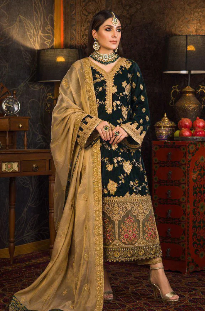 D-107 Green Color Embroidered Velvet Three piece Winter Collection